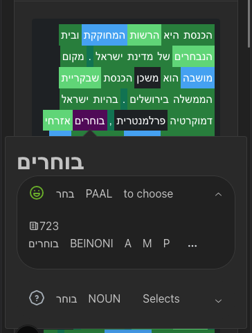 Quickly see all forms of a word by clicking on it. NLL shows all the possible forms, along with grammatical features (root, pattern, etc.), helping you understand the highly ambiguous words found in Arabic and Hebrew.